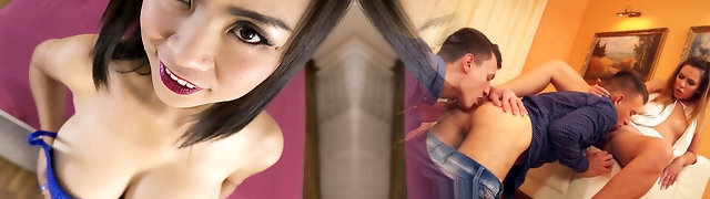Rough bang-out and threesome with an Asian chick with big tits on the bed