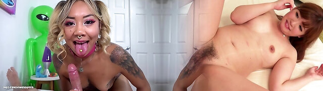 Tattooed Asian babe with tremendous boobs gets her poon drilled and licked