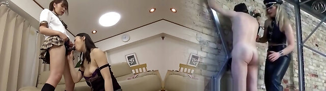 Cute slim Japanese lesbian girl dominated by huge-titted milf slut