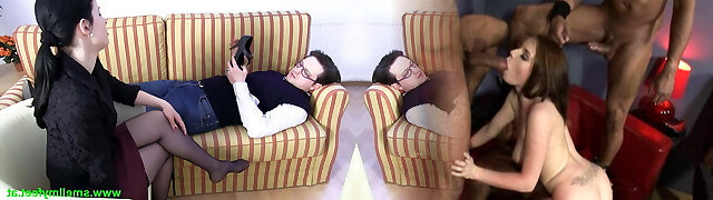 The long legs of the queen in black stockings are tempting and she trains the foot fetishist to have footjob and hump!