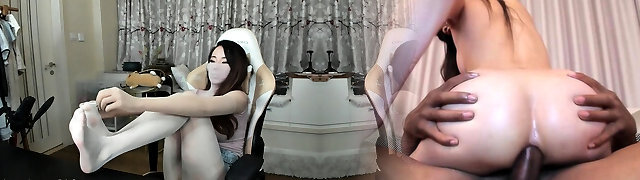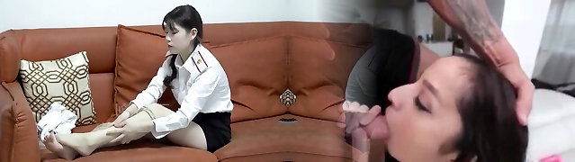 Cute Chinese teens does an exciting footjob before spreading her gams for sex.