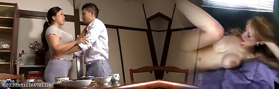 Promiscuous Japanese wife, Rina Araki, ditches her crimson lingerie to reveal herself for this boy and gets a creampie.